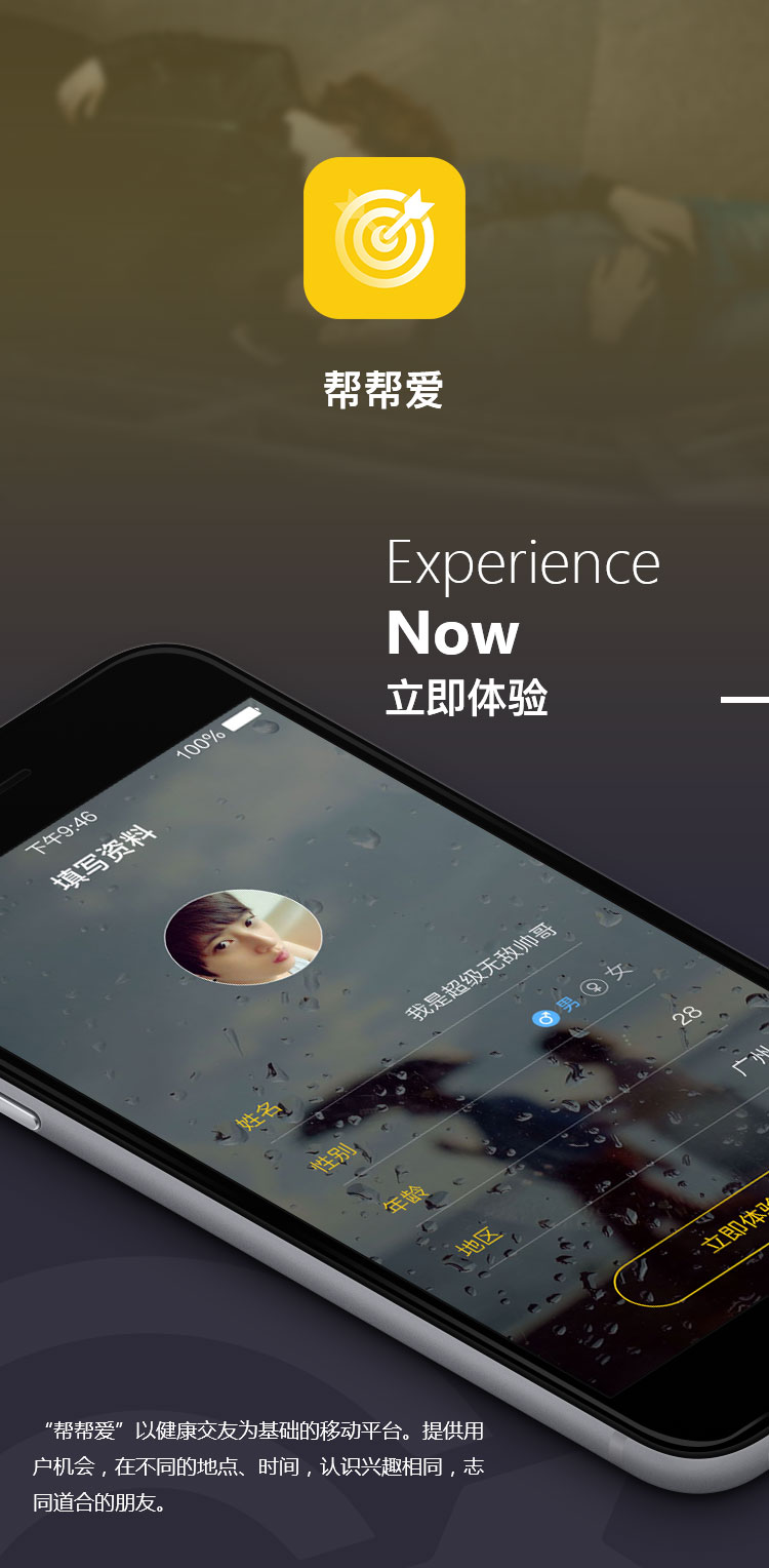 “帮帮爱”以健康交友为基础的移动平台,给用户提供机会,在不同的地点、时间,认识兴趣相同、志同道合的朋友。首页展示介绍各个好友的个人基本信息,用户通过上拉浏览了解更多好友,切换顶部导航还可以查看交友成功情况,快速浏览,即时交友。